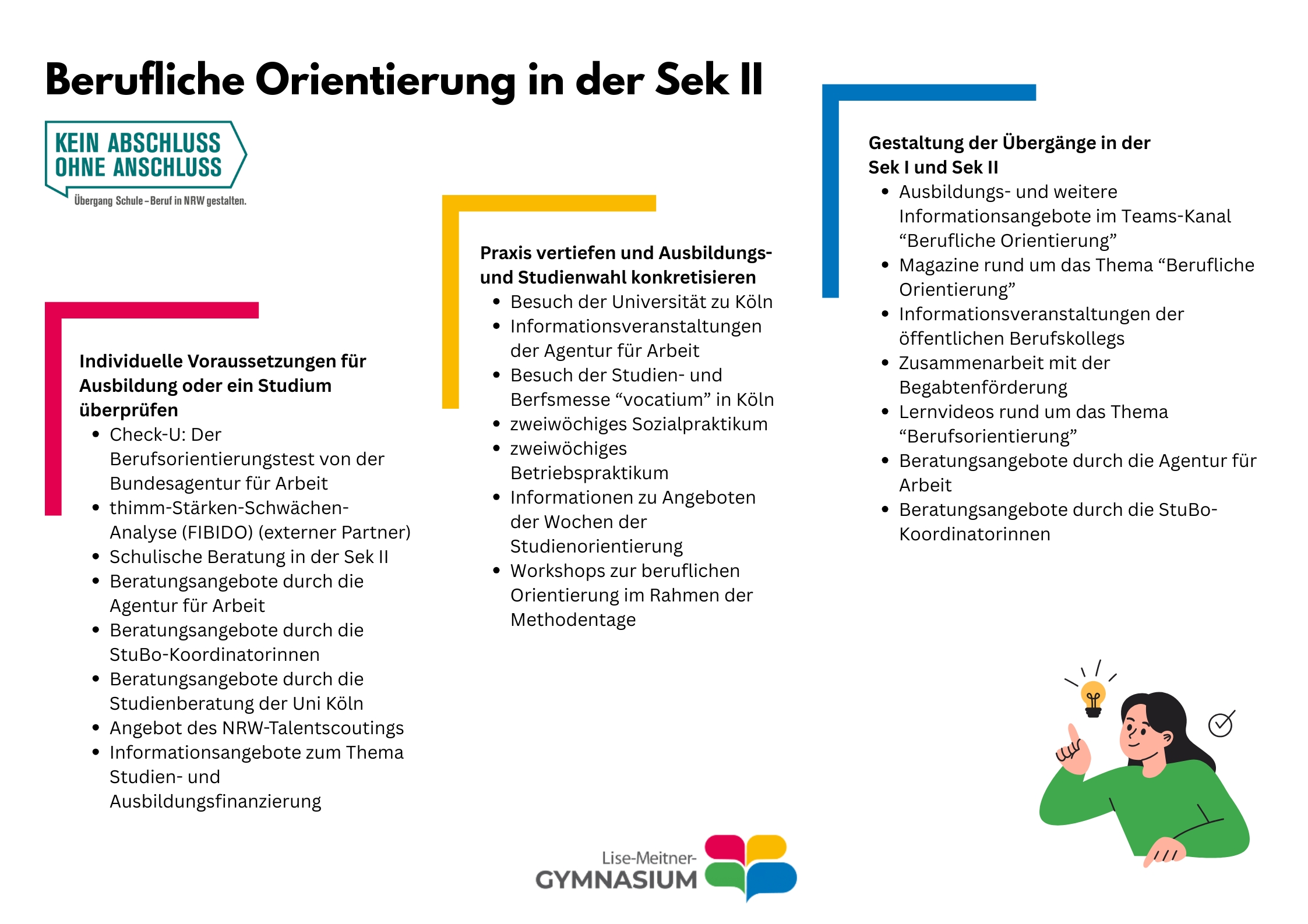 Die Studien- und Berufsorientierungstage in der Q1 bilden das Herzstück der beruflichen Orientierung am Lise-Meitner-Gymnasium. Über viele Jahre wurde ein umfangreiches Programm entwickelt, um die Schülerinnen und Schülern in ihrem Berufs- und Studienwahlprozess zu unterstützen. Durch eine jährlich durchgeführte Bewertung der Studien- und Berufsorientierungstage wird sichergestellt, dass wir unser Programm immer wieder neu überdenken und an die Bedürfnisse der Heranwachsenden anpassen.