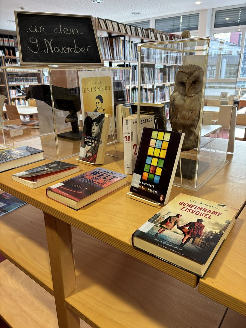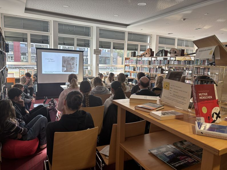 Mit einem literarisch so vielfältigen Programm wie noch nie trafen sich Schüler:innen, Lehrer:innen und weitere Interessierte der Schulgemeinde am Donnerstag, dem 6.11. zur Mittagspause in der Bibliothek, um zum 6. Mal Teil der Gedenkveranstaltung „Lise erinnert…“ zu werden. Musik geleitete die Teilnehmenden, die sich schon in der Ausstellung mit Büchern, Zitaten und Hintergrundinformationen umgeschaut hatten, zu ihren Plätzen. In der Einführung machte Frau Schulte unter anderem mit Worten von Lena Gorelik und einem ausgewählten Spot von den #StopRepeatingStories sehr deutlich, dass Erinnern nicht nur die Vergangenheit betrifft, sondern eine besondere Bedeutung für uns und unsere Gegenwart hat. Und das zeigten auch alle neun literarischen und musikalischen Beiträge aus dem Kreis des aktuellen Deutsch Leistungskurses und weiteren Schülerinnen der Stufen EF, 7 und 6!