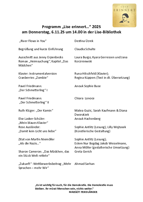 Wir danken allen Teilnehmenden, besonders den Gestalter:innen für diese besondere Veranstaltung, die inzwischen ein fester Bestandteil des Lise-Kulturprogramms geworden ist und uns jedes Jahr aufs Neue daran erinnert, dass Demokratie, Freiheit und Frieden keine Selbstverständlichkeit sind, sondern ihr Fortbestand auch in unseren Händen liegt, indem wir uns alltäglich für Zusammenhalt im Sinne unserer demokratischen Werte und gegen Diskriminierung und Ausgrenzung einsetzen.