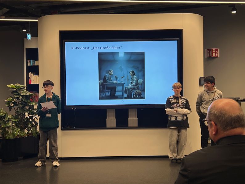 In der zweiten Phase der AG setzten sie mit den erworbenen Wissen und Kompetenzen eigene Projekte kreative um, indem sie KI-Tools als Werkzeug nutzten. Es entstanden vier unterschiedliche Projekte (drei Spiele – davon ein klassisches Brettspiel – und ein Podcast) mit einem sozialen oder ökologischen Nachhaltigkeitsaspekt. Diese Projekte wurden in einer Abschlussveranstaltung am 27.01.26 vor Publikum in der Covestro-Zentrale vorgestellt und prämiert.