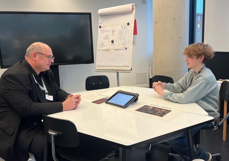 In einer Podiumsdiskussion stellten vier Teilnehmer*innen der AG Oberbürgermeister Stefan Hebbel, Florian Frankenau (Covestro), Andrea Schmitz (St. Oberholz), Harry Voges (AGU) und Athisakthy Dederichs (Informatiklehrerin, Lise Meitner Gymnasium, erste Partnerschule der KI AG) spannende Fragen, wie z.B.: “Nutzen Sie KI im Alltag?”, “Vertrauen Sie der KI mehr als Menschen?” oder “Wird es in Zukunft in Leverkusen autonome Schulbusse geben?”.