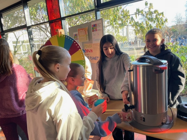 Neben der Kostümtauschbörse im PZ gab es noch einige weitere Angebote in der Pausenhalle und draußen auf dem Hof. Sehr beliebt war wie immer unser Klimaquiz, wo die Schüler:innen am Glücksrad drehen und dann ihr Wissen zu Klimafragen testen konnten.