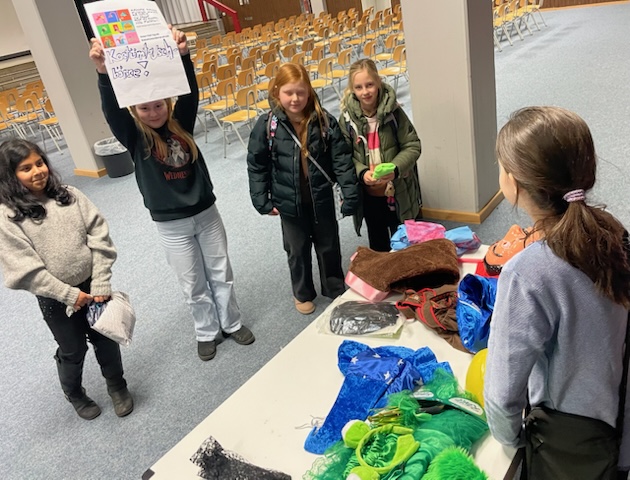 Dazu wurde das PZ in allen großen Pausen geöffnet und alle konnten sich dort wie auf einem Markt begegnen und tauschen. Manch eine:r freute sich auch über letzte fehlende Accessoires, wie zum Beispiel giftgrüne Handschuhe fürs Waldfeenkostüm.